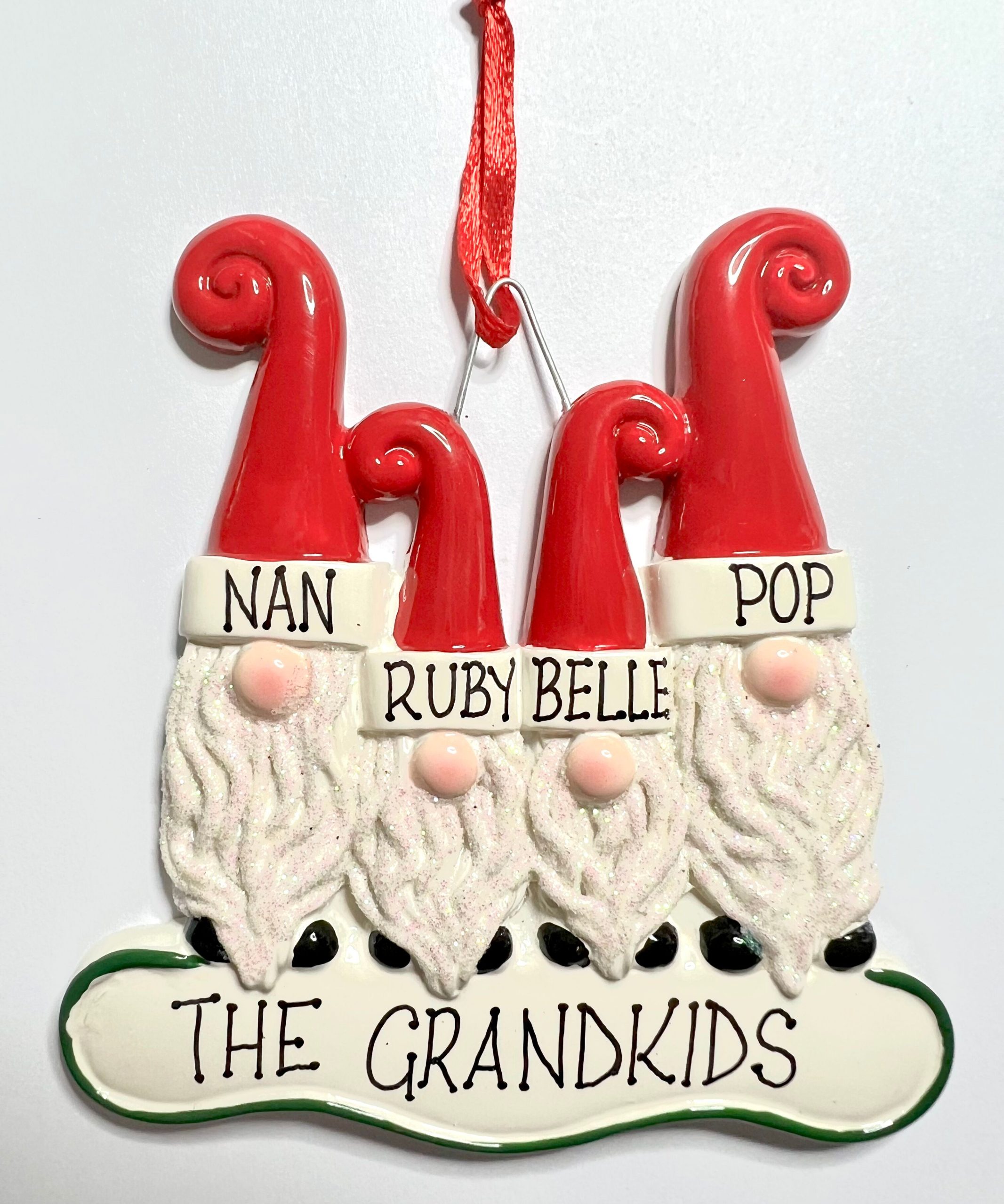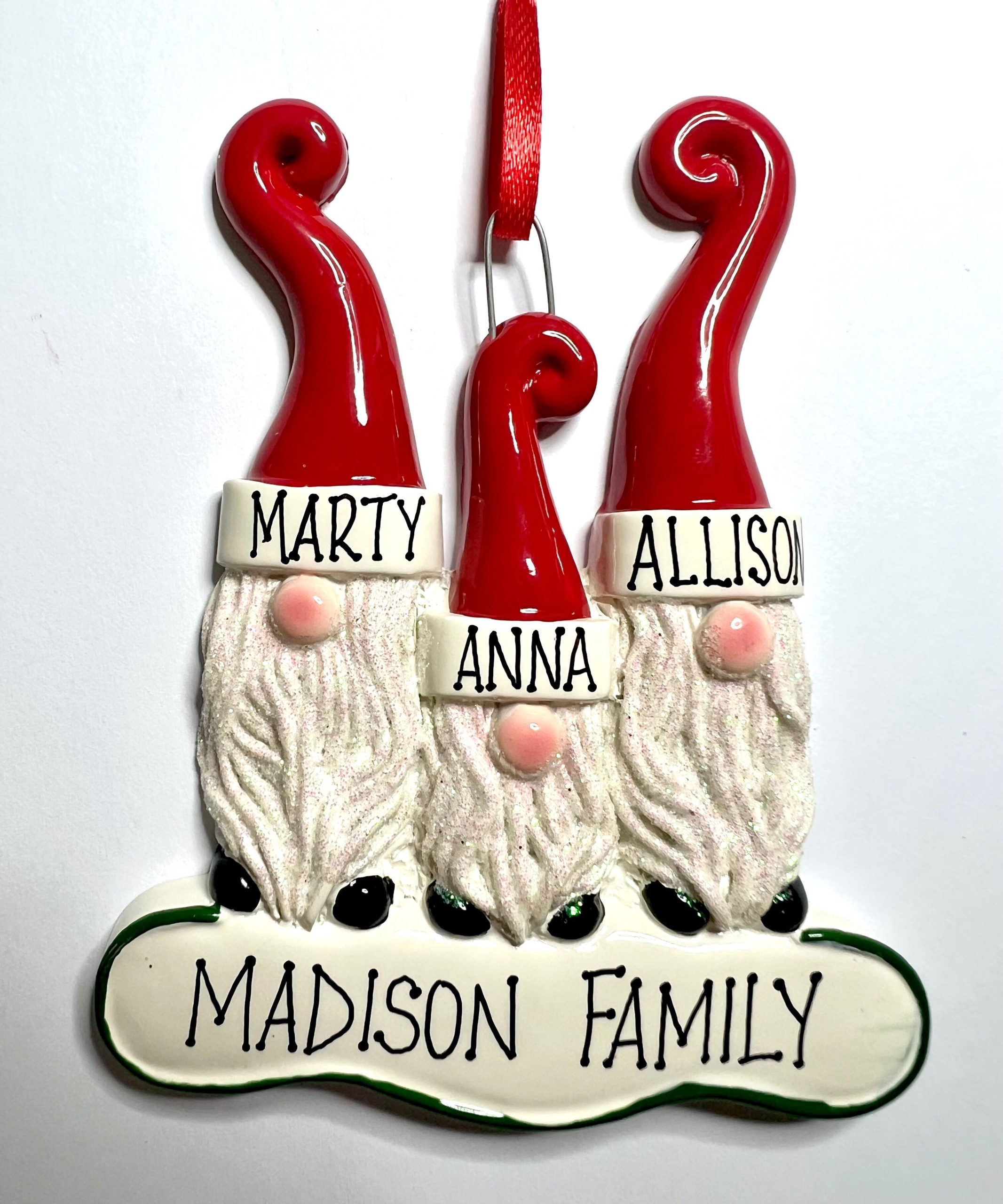 The photo’s don’t do justice to this adorable ornament. Features glitter beards on each gnome.