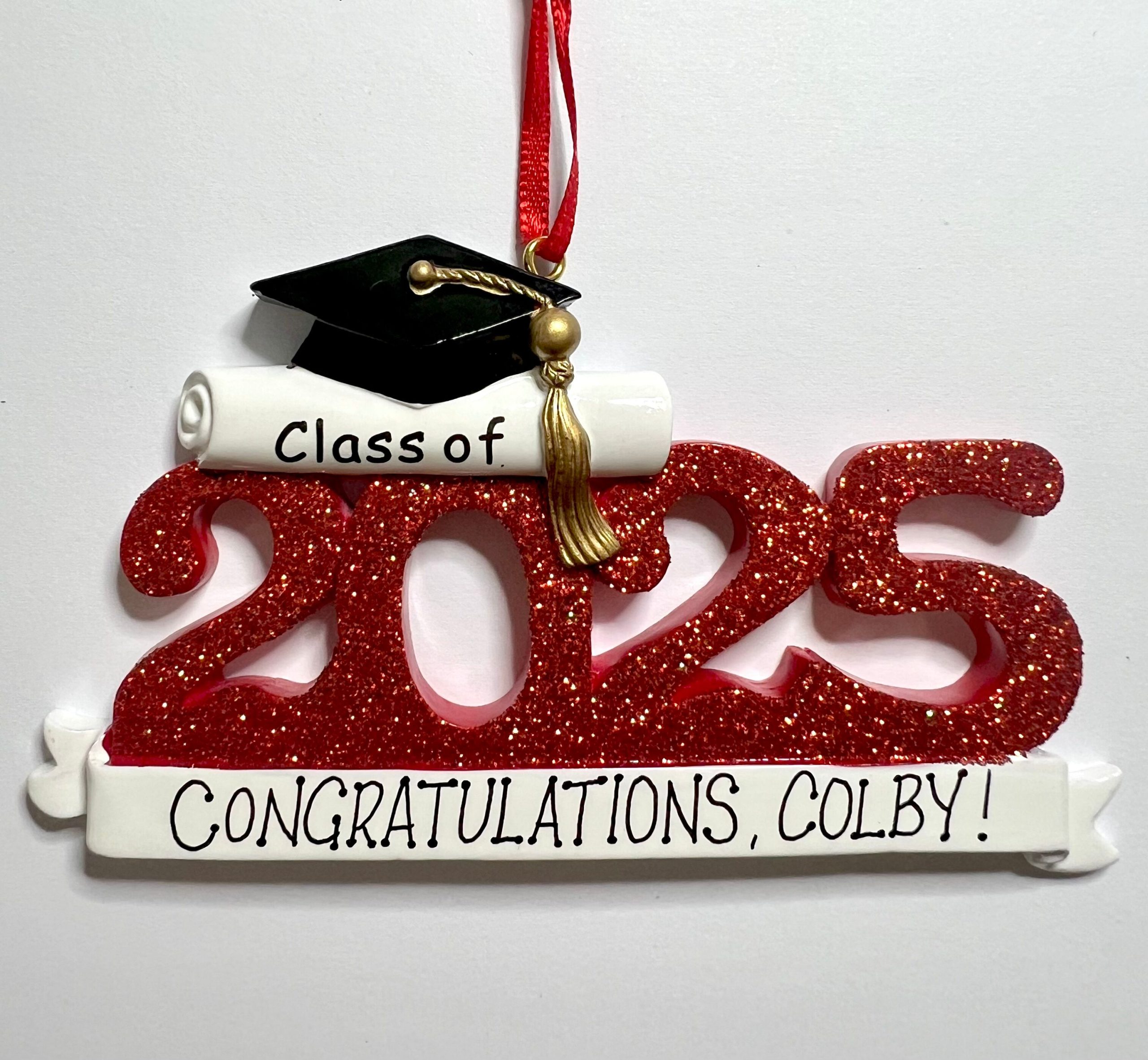 Features glitter on 2025. ‘Class of’ on scroll is permanent.
